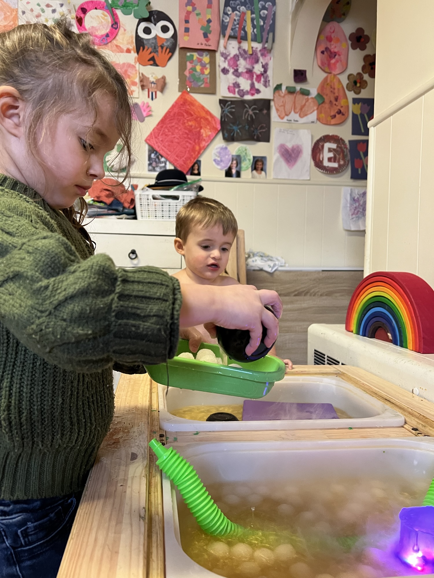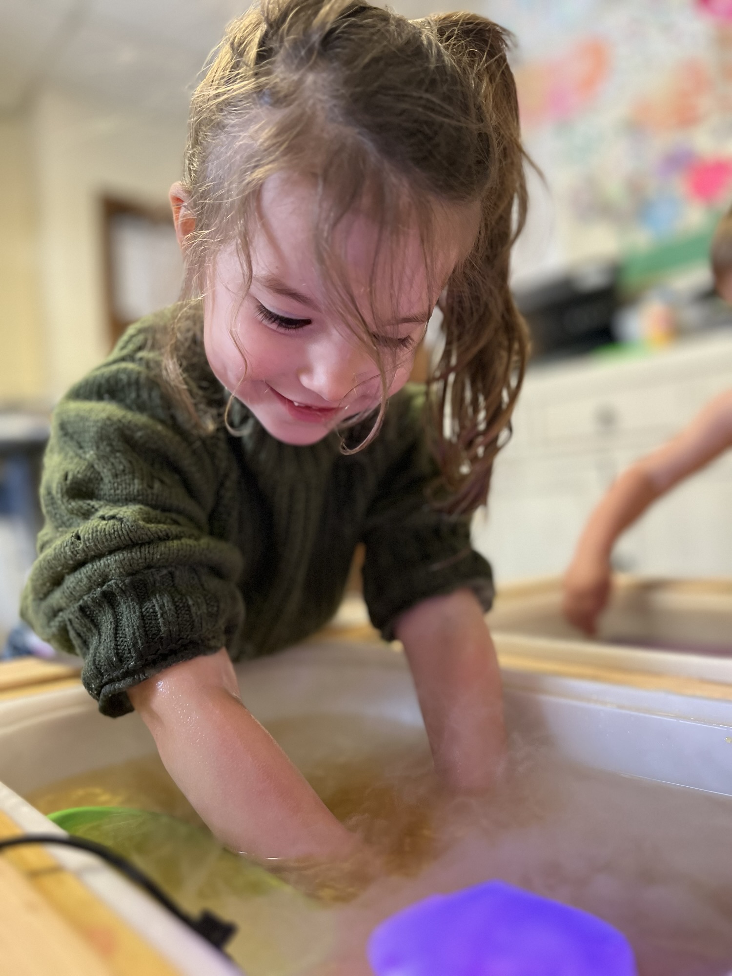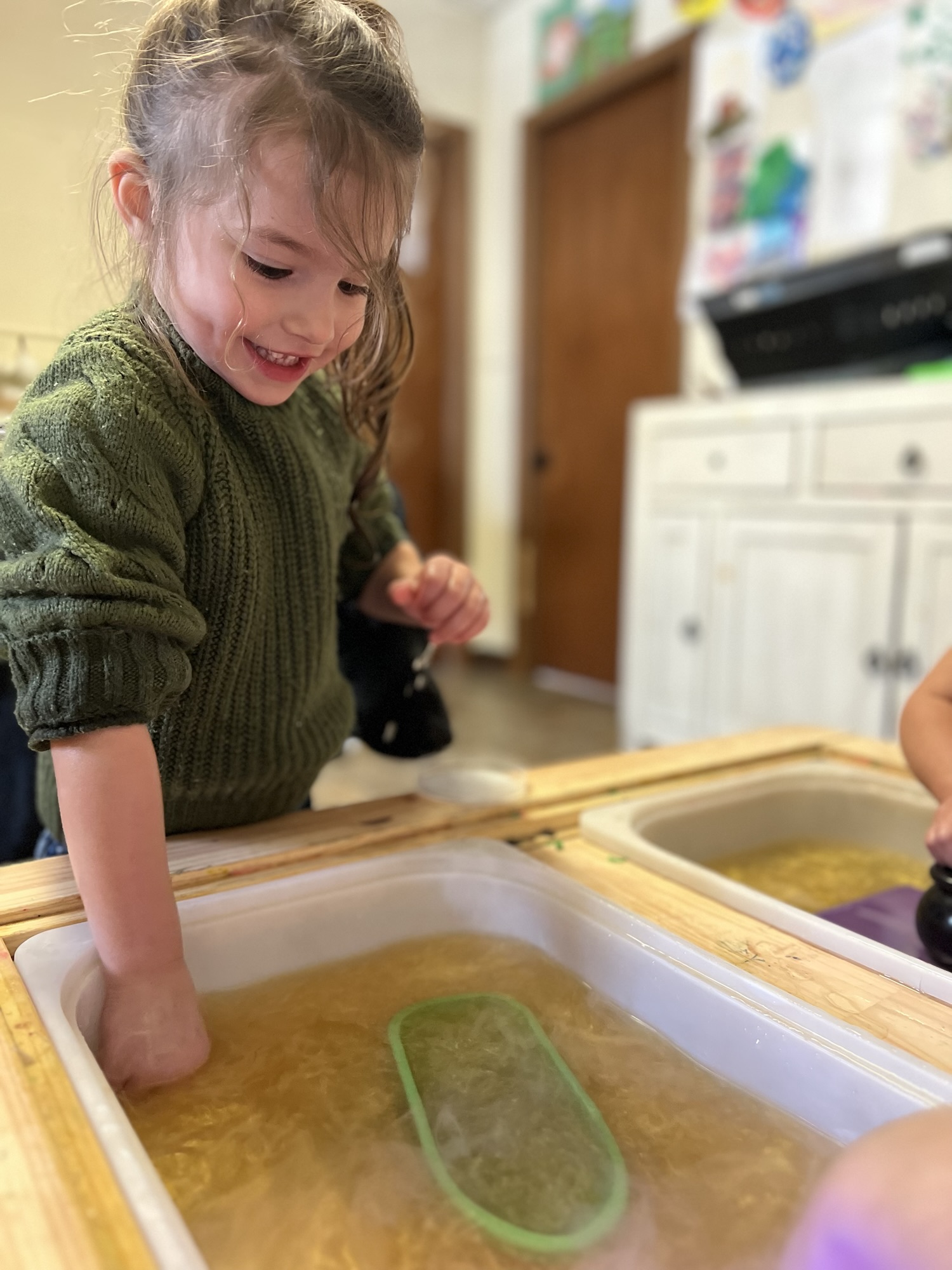 Beyond the storytelling, they explored the feel of the water and rocks—the smoothness of the stones, the way the gold shimmer swirled in the water, and the contrast between solid and liquid. They experimented with different objects, predicting which would sink or float, adding another layer of learning.