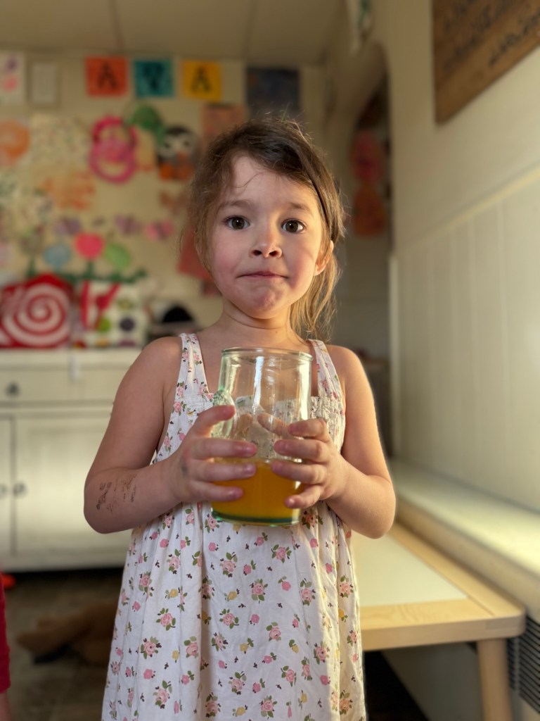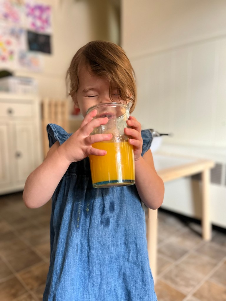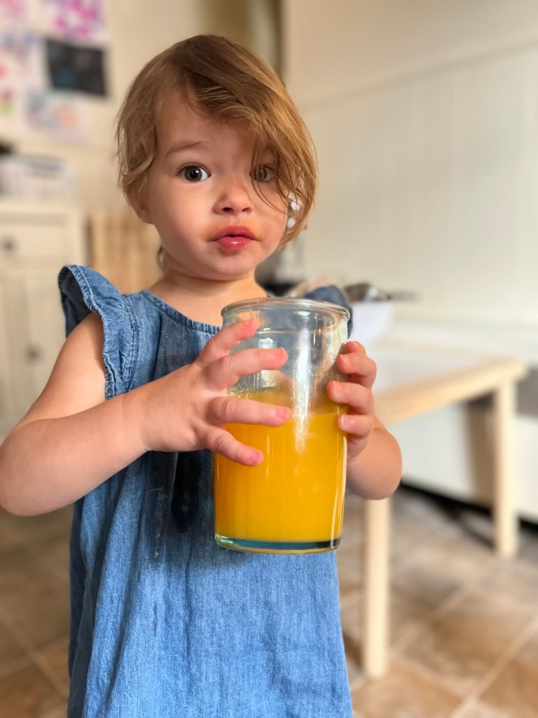 Yes—it’s a gross motor activity! Squeezing an orange, especially with a manual juicer, requires coordination, core strength, and bilateral movement (using both sides of the body). It’s a great way to sneak in some muscle work for those busy little bodies.